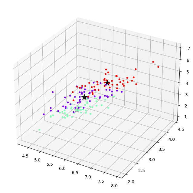 ax.scatter(centers[:,0],centers[:,1],centers[:,2] ,c='black', s=200, marker='*')