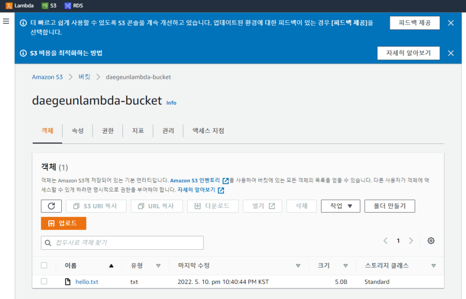 다음 텍스트 파일을 만드신 버킷에 업로드를 시켜줍니다.