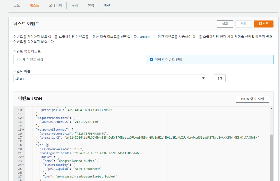 S3run이름을 만들어 다음 코드를 입력해준 후, 저장 - 테스트를 눌러줍니다.