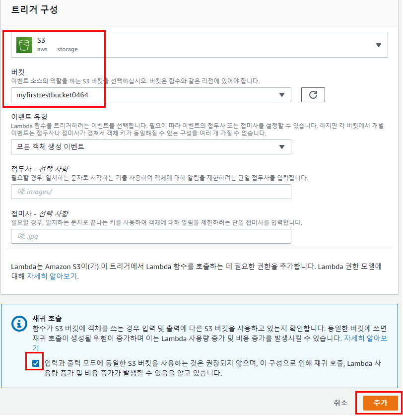 이벤트유형은 파일이 업로드 되는 경우 람다 호출이 되도록 모든 객체 생성이벤트를 눌러줍니다.
