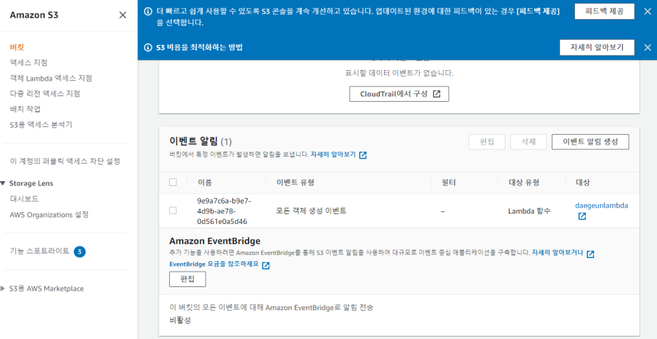 다음으로 구성-버킷-속성-이벤트알림을 들어가줍니다.